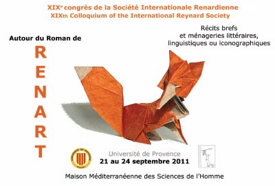 « XIXe Congrès international de la Société Internationale Renardienne. Roman de Renart ou récits brefs : ménageries littéraires, linguistiques ou iconographiques », 21-24 septembre 2011. Université de Provence, Maison Méditerranéenne des Sciences de l’Homme, 5 rue du château de l’horloge, 13094 Aix-en-Provence. Tél: 04 42 52 40 00.