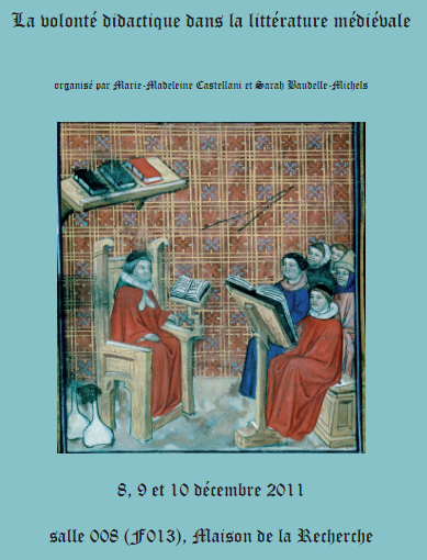 La volonté didactique dans la littérature médiévale, colloque organisé par Marie-Madeleine Castellani et Sarah Baudelle-Michel, du jeudi 8 au samedi 10 décembre 2011. Université Lille-III – Maison de la recherche – Salle F013.