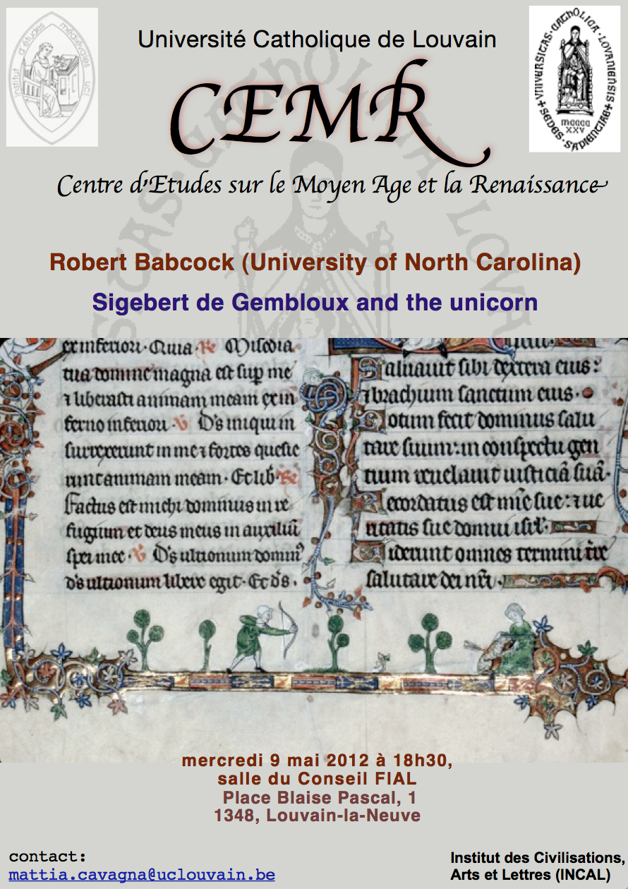 Longtemps conservateur des manuscrits et des livres anciens à la Beinecke Rare Books and Manuscript Library de l’université de Yale à New Haven, Robert Babcock est à présent professeur à l’université de Caroline du Nord à Chapel Hill. Il a développé des recherches fondamentales sur les milieux monastiques de nos régions, publiant entre autres sur les écoles de Liège aux XIe et XIIe s., et il travaille pour le moment sur le scriptorium de Gembloux. Dans ce cadre, il nous remettra en mémoire la personnalité du grand historien Sigebert de Gembloux en prenant quelques voies moins fréquentées, suivant la trace de la licorne des bestiaires. C’est tout un pan de l’activité littéraire à la jonction des XIe et XIIe siècles qu’il nous fera ainsi découvrir.