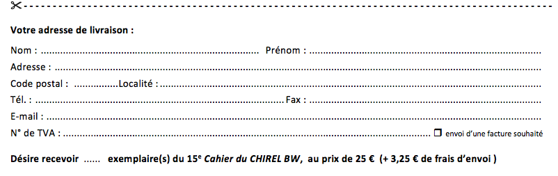 Paiement à la commande par virement sur le compte du CHIREL BW : BE54 0682 0305 7197 – BIC GKCCBEBB avec la communication « Cahier 15 + vos coordonnées ». Dès réception de votre paiement, nous vous ferons parvenir votre exemplaire.