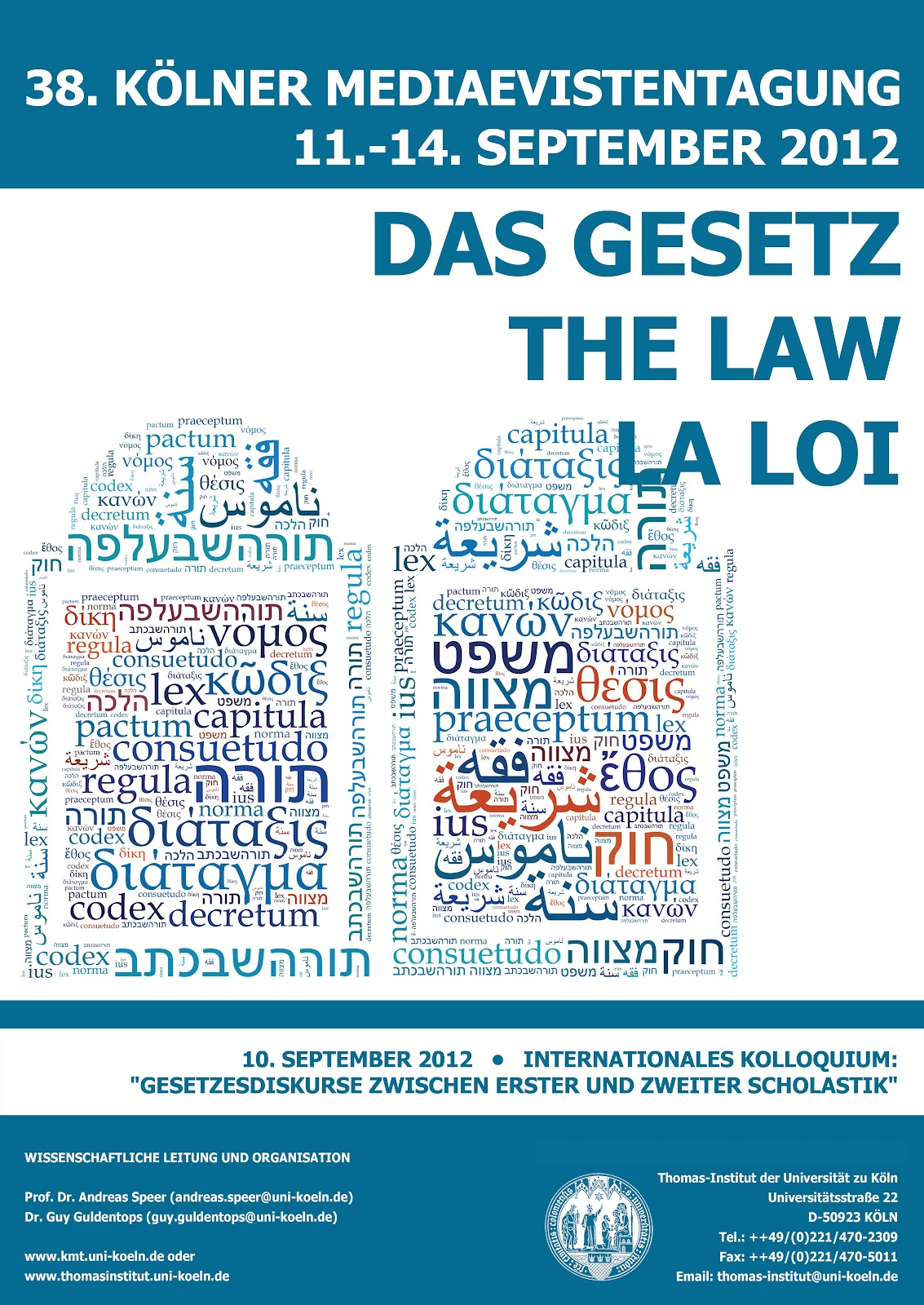 Vom 11.-14. September findet die 38. Kölner Mediaevistentagung Das Gesetz – The Law – La Loi in Köln statt. Außerdem wird am 10. September ein Internationales Kolloquium zum Thema « Gesetzesdiskurse zwischen Erster und Zweiter Scholastik » abgehalten.