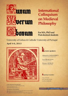 It is the main purpose of this colloquium to bring together MA, PhD and Post-Doctoral researchers in Medieval Philosophy from universities around the world, and also to encourage philosophical discussion between all the participants. Should you be interested in participating in this meeting we invite you to submit a paper proposal (according to the rules stated below). We welcome you in advance to Lisbon, the city of the seven hills.