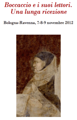 L’interpretazione dell’opera di Giovanni Boccaccio, di cui si celebrerà nel 2013 il VII Centenario della nascita, è stata rinnovata negli ultimi decenni dall’apporto di competenze disciplinari diverse, dalla teoria della letteratura alla storia dell’arte, dalla storia medievale alla storia dello spettacolo alla comparatistica. Nei giorni 7-8-9 novembre 2012, il Dipartimento di Filologia Classica e Italianistica di Bologna, in collaborazione con il Dipartimento di Conservazione dei Beni culturali di Ravenna, organizzerà un convegno su Giovanni Boccaccio (« Boccaccio e i suoi lettori. Una lunga ricezione »). La prima giornata del Convegno metterà in evidenza la complessa interdisciplinarità della critica boccacciana. La seconda giornata avrà per oggetto la ricezione del Boccaccio in età rinascimentale in Italia e in Europa. La terza e ultima giornata, che si svolgerà a Ravenna, sarà dedicata ai rapporti tra Boccaccio e l’opera di Dante e al legame di Boccaccio con la cultura classica e medievale.