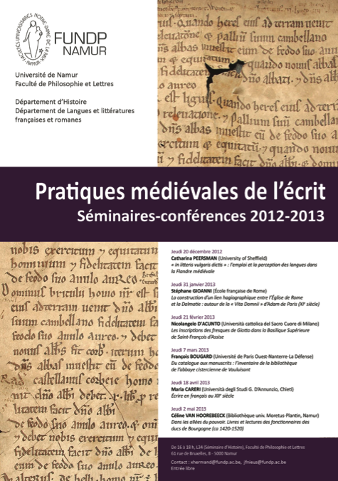 Créé en 2011, le Centre de recherche « Pratiques médiévales de l’écrit » réunit les médiévistes de l’Université de Namur (enseignants, chercheurs, doctorants et post-doctorants) qui s’intéressent à la problématique multiforme de l’écrit au Moyen Âge, ainsi qu’une vingtaine de membres associés belges et étrangers. Son objectif principal est de promouvoir les collaborations à tous niveaux dans ce secteur de la médiévistique occidentale actuellement en plein essor, grâce à des initiatives de coordination et de décloisonnement de la recherche, qui passent notamment par l’organisation de colloques, de conférences et d’ateliers de recherche interdisciplinaires.