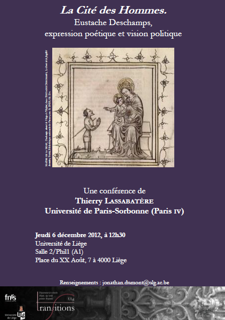 Le jeudi 6 décembre 2012 à 12h30, dans le cadre du cycle annuel de conférences organisé par Transitions, Thierry Lassabatère (Université de Paris-Sorbonne – Paris IV) présentera une communication intitulée La Cité des Hommes. Eustache Deschamps, expression poétique et vision politique.