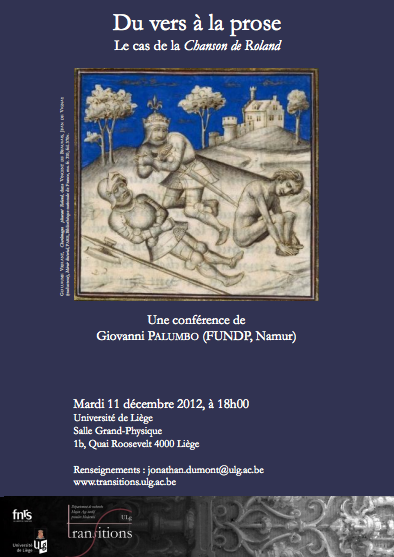 Le mardi 11 décembre 2012 à 18h00, dans le cadre du cycle annuel de conférences organisé par Transitions (ULg), Giovanni Palumbo (FUNDP – Namur) présentera une communication intitulée Du vers à la prose. Le cas de la Chanson de Roland.