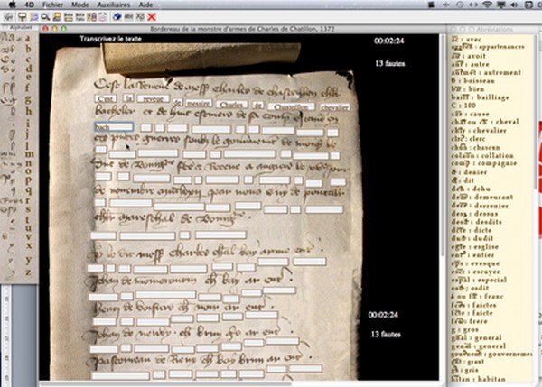 Ce logiciel a été mis au point par Hervé Mouillebouche, maître de conférences en histoire médiévale de l’université de Bourgogne pour un enseignement de paléographie de master d’histoire médiévale. Il donne des consignes de base pour la transcription et le développement des abréviations, puis propose 16 exercices, à réaliser de préférence dans l’ordre présenté par le logiciel, qui permettent de progresser à partir de n’importe quel niveau, jusqu’aux textes français les plus difficiles à lire.