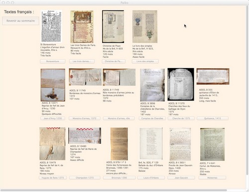 Le logiciel « Paléo.fr » permet d’apprendre la paléographie médiévale française, seul ou en groupe, par des exercices interactifs progressifs. La présente version « Paléo.fr 2012.1 » contient 16 textes français des XIIIe, XIVe et XVe siècles, présentant une grande variété d’écritures et de documents de la France du nord.