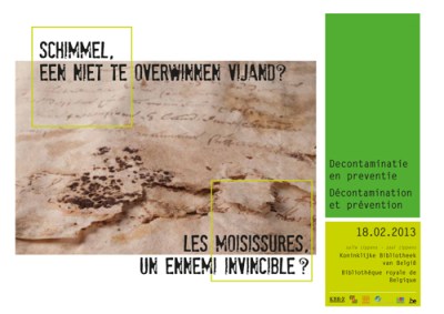 Le lundi 18 février 2013, les Archives générales du Royaume, la Bibliothèque royale de Belgique et l’Institut royal du Patrimoine artistique organisent conjointement un colloque international relatif aux traitements de décontamination de masse des moisissures et à leur prévention