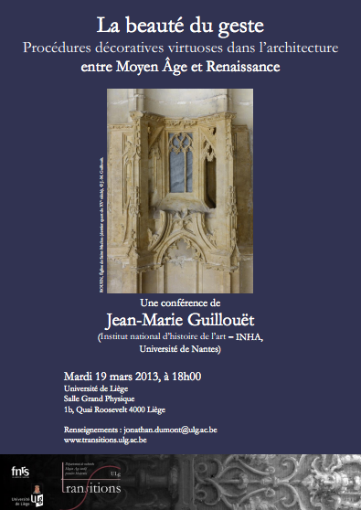 Le mardi 19 mars 2013 à 18h00, dans le cadre du cycle annuel de conférences organisé par Transitions, Jean-Marie Guillouët (Institut national d’histoire de l’art – INHA, Université de Nantes) présentera une communication intitulée La beauté du geste. Procédures décoratives virtuoses dans l’architecture entre Moyen Âge et Renaissance.