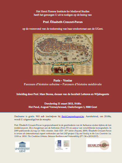 Prof. Élisabeth Crouzet-Pavan is gespecialiseerd in de geschiedenis van de Italiaanse steden tijdens de late middeleeuwen. Zij is hoogleraar aan de Sorbonne (Paris IV) en auteur van verschillende monografieën. In 2009 publiceerde zij nog Les Villes vivantes. Italie XIIIe-XVe siècles (Fayard, 2009). Élisabeth Crouzet-Pavan is tevens als internationaal expert verbonden aan het IAP-project City and Society in the Low Countries (ca 1200-ca 1850). The Condition Urbaine: Between Resilience and Vulnerability (P7 / 26 – 2013-2017).