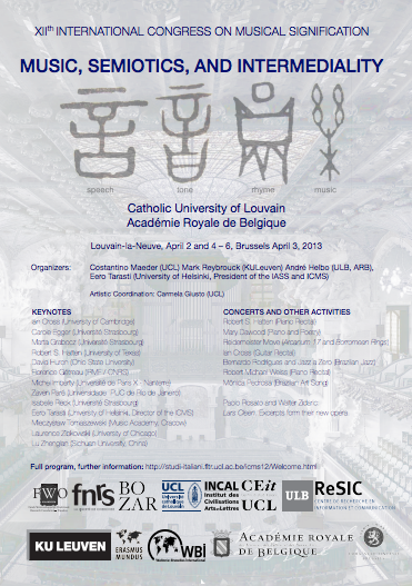 The 11th ICMS in Krakow (Poland) was a resounding success. The 12th International Congress will be organized in Belgium from april 2 – 6, 2013 at Louvain-la-Neuve and Brussels. It will be organized jointly by the Center for Italian Studies (Université Catholique de Louvain) (UCL), the University of Leuven (KU Leuven) and the Université Libre de Bruxelles (ULB) under the auspices of the International Association for Semiotic Studies (IASS), with the University of Helsinki and the International Semiotics Institute (ISI) as co-organizers and Professors Costantino Maeder (UCL), Mark Reybrouck (KU Leuven), André Helbo (ULB, ARB) and Eero Tarasti (Director of the Musical Signification Project, University of Helsinki) as Directors.