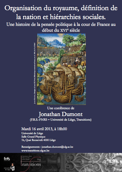 Le mardi 16 avril, à 18h00, dans le cadre du cycle annuel de conférences organisé par Transitions, Jonathan Dumont (F.R.S.-FNRS – Université de Liège) présentera une communication intitulée Organisation du royaume, définition de la nation et hiérarchies sociales. Une histoire de la pensée politique à la cour de France au début du XVIe siècle
