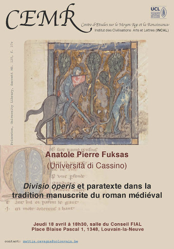 Le jeudi 18 avril à 18h30, Anatole Pierre Fuksas (Università di Cassino) présentera une communication intitulée « Divisio operis » et paratexte dans la tradition manuscrite du roman médiéval.
