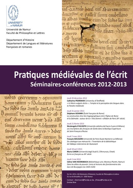 Le jeudi 2 mai 2013 à 16h00, dans le cadre du cycle annuel de séminaires-conférences organisé par le centre de recherche « Pratiques médiévales de l’écrit » (Université de Namur), Céline Van Hoorebeeck (BUMP – UNamur) présentera une communication intitulée Dans les allées du pouvoir. Livres et lectures des fonctionnaires des ducs de Bourgogne (ca 1420-1520).