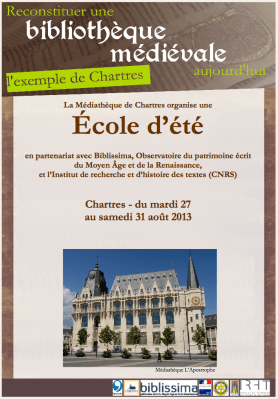 La Médiathèque L’Apostrophe de Chartres et l’Institut de recherche et d’histoire des textes organisent, du mardi 27 août au samedi 31 août 2013, en partenariat avec l’Equipex Biblissima, une première école d’été consacrée à la reconstitution des bibliothèques médiévales.