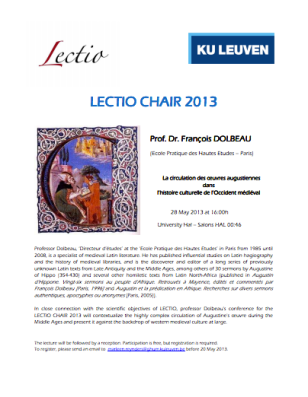 In close connection with the scientific objectives of LECTIO, professor Dolbeau’s conference for the LECTIO CHAIR 2013 will contextualize the highly complex circulation of Augustine’s œuvre during the Middle Ages and present it against the backdrop of western medieval culture at large.