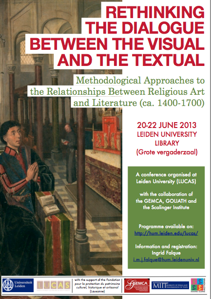 During this conference, we would like to focus on the methodological approaches to the relationships between religious art(s) and literature(s) of the Late Middle Ages and the Early Modern Period, with special emphasis on the mystical traditions of these periods. The conference aims to explore not only the many forms of interactions between religious texts and images in this period, but also the methodological and theoretical issues they imply in order to sketch an overview of the different approaches used by scholars while studying texts and images together. Among others, the following forms of dialogue between the visual and the textual will be at the centre of this enquiry: the influence of spiritual authors on pictorial practices; the visual and textual discourses on images in mysticism; the impact of works of art on religious literary production; the complex text/image relationships in illuminated manuscripts, in printed books or in emblems books; the links between visual and biblical exegesis, the connections between painters and rhetoricians, etc. On a more general level, speakers will discuss how religious texts and images can work together in order to produce meaning, the capacity of a text not only to signify but also to represent, and the ability of a work of art (or an image) not only to depict but also to produce sense.