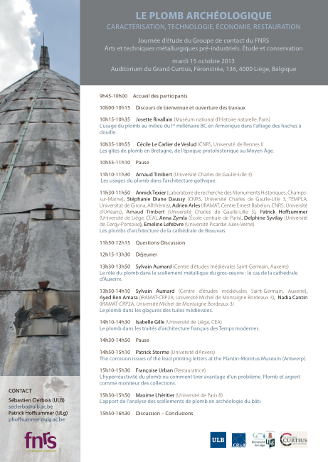 11h30-11h50 : Annick Texier (Laboratoire de recherche des Monuments Historiques, Champs- sur-Marne), Stéphanie Diane Daussy (CNRS, Université Charles de Gaulle-Lille 3, TEMPLA, Universitat de Girona, ARthémis), Adrien Arles (IRAMAT, Centre Ernest Babelon, CNRS, Université d’Orléans), Arnaud Timbert (Université Charles de Gaulle-Lille 3), Patrick Hoffsummer (Université de Liège, CEA), Anna Zymla (École centrale de Paris), Delphine Syvilay (Université de Cergy-Pontoise), Emeline Lefebvre (Université Picardie Jules-Verne) – Les plombs d’architecture de la cathédrale de Beauvais.