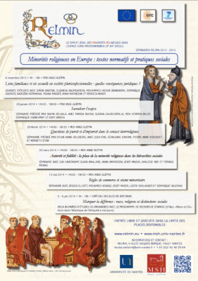 Le projet de recherche RELMIN sur le statut légal des minorités religieuses dans l’espace euro-méditerrannée entre le Ve et le XVe siècle organise comme chaque années depuis 2010 une série de séminaires et de journées d’études. Les séances de l’année 2013-2014 s’organisent autour de la thématique « Minorités religieuses en Europe : textes normatifs et pratiques sociales » et sont l’occasion de découvrir le travail de l’équipe RELMIN ainsi que celui des chercheurs internationaux qui sont conviés pour leur expertise dans un domaine spécifique.