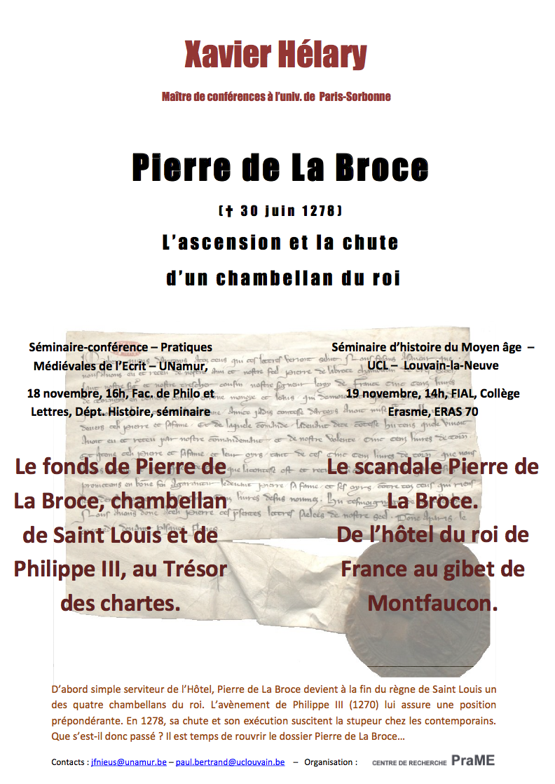 Les lundi 18 et mardi 19 novembre 2013, Xavier Hélary (Université de Paris IV) présentera deux communications consacrées à Pierre de la Broce, chambellan de Saint-Louis et de Philippe III ; la première dans le cadre du séminaire « Pratiques de l’écrit » de l’UNamur, la seconde lors d’une séance du séminaire d’histoire du moyen âge de l’UCL.