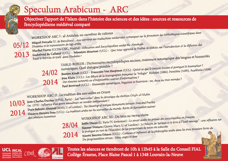 Dans le cadre de l’ARC Speculum Arabicum. Objectiver l’apport de l’Islam dans l’histoire des sciences et des idées: sources et ressources de l’encyclopédisme médiéval (Université Catholique de Louvain), nous sommes heureux de vous annoncer la tenue du workshop ARC I: al-Andalus, un carrefour de cultures, le jeudi 5 décembre 2013 de 10h à 12h45 , à la Salle de Conseil de la Faculté de Philosophie, Arts et Lettres de l’UCL.