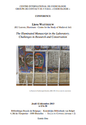 Le jeudi 12 décembre à 13h30, Lieve Watteeuw (KU Leuven, Illuminare – Centre for the Study of Medieval Art) présentera une conférence intitulée The Illuminated Manuscript in the Laboratory. Challenges in Research and Conservation. Cette conférence, organisée par le Centre International de Codicologie et « Codicologie » – Groupe de contact du FNRS, se tiendra à la Bibliothèque royale de Belgique (Bruxelles).