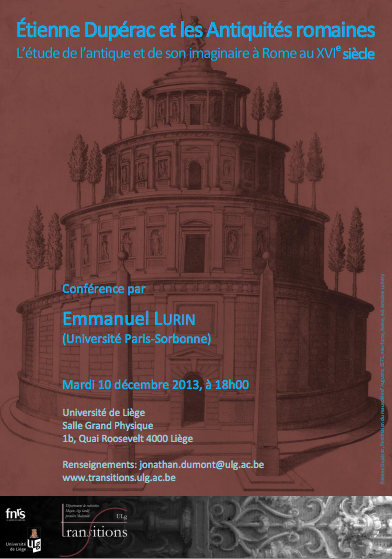 Dans le cadre du cycle de conférences de Transitions (Université de Liège), Emmanuel Lurin (Paris-Sorbonne) donnera une conférence le 10 décembre intitulée Étienne Dupérac et les Antiquités romaines. L’étude de l’antique et de son imaginaire à Rome au XVIe siècle.