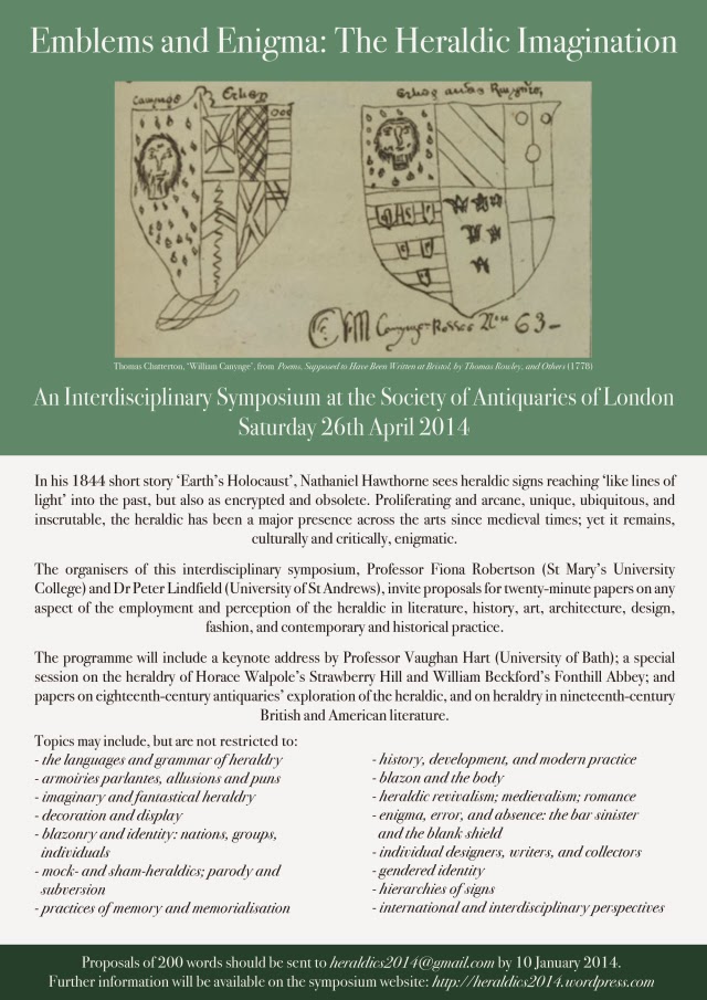 The organisers of this interdisciplinary symposium, Professor Fiona Robertson (St Mary’s University College) and Dr Peter Lindfield (University of St Andrews) invite proposals for twenty-minute papers on any aspect of the employment and perception of the heraldic in literature, history, art, architecture, design, fashion, and contemporary and historical practice. The programme will include a keynote address by Professor Vaughan Hart (University of Bath); a special session on the heraldry of Horace Walpole’s Strawberry Hill and William Beckford’s Fonthill Abbey; and papers on eighteenth-century antiquaries’ exploration of the heraldic, and on heraldry in nineteenth-century British and American literature.