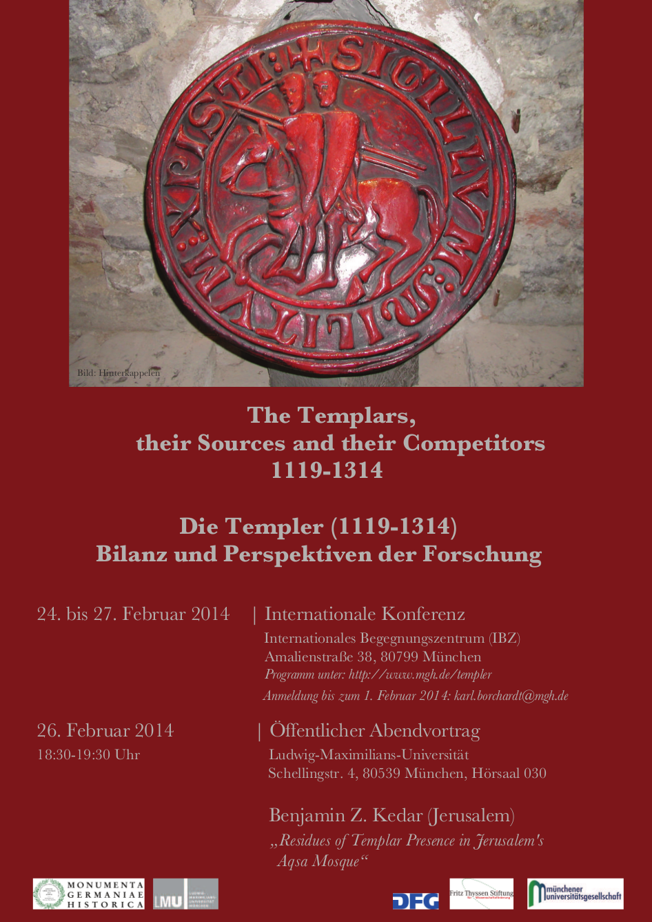 Die internationale Konferenz soll daher Gelegenheit bieten, den wissenschaftlichen Ertrag der neueren Forschung zu den Templern im Vergleich zu den anderen Ritterorden kritisch zu würdigen. Dabei sind besonders offene Fragen und Desiderata hinsichtlich der Quellenerschließung herauszuarbeiten und zu diskutieren.
