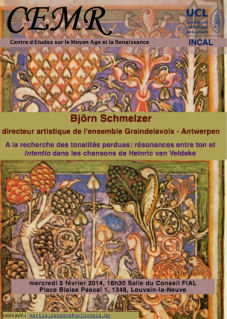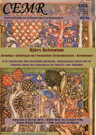 Henri de Veldeke, né dans le Limbourg au milieu du XIIe siècle, est le premier auteur littéraire de nos régions à avoir écrit en langue vernaculaire, en l’occurrence le moyen néerlandais ou ancien bas-allemand. On garde de lui une Vie de saint Servais, une adaptation du Roman d’Eneas, et une trentaine de pièces lyriques. Tout ceci était à l’époque soutenu d’un accompagnement musical, à la manière des Minnesänger, malheureusement perdu. On peut cependant tenter l’aventure musicale, ce qui a fait l’objet d’un projet collectif original présenté lors de la dernière édition du Dag van de Oude Muziek d’Alden Biezen en juin dernier.