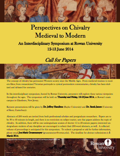 Abstracts of 200 words are invited from both professional scholars and postgraduate researchers. Papers are to be 30 to 40 minutes in length, and there is no restriction on subject matter, save that papers address the topic of chivalry. In addition, there will be one undergraduate session of shorter 15 to 20-minute papers; interested un- dergraduate students of any discipline are encouraged to submit their 200-word abstracts, as well. A collected volume of proceedings is anticipated for this symposium. To submit a proposal or ask for further information, please email Jon-Mark Grussenmeyer (grussenmeyer@rowan.edu). The deadline for abstract submissions is 1 March 2014.