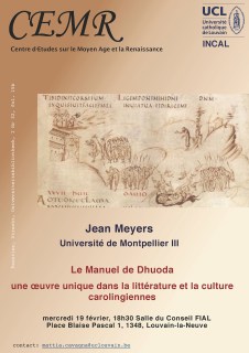 Le Manuel pour mon fils de Dhuoda, dont Jean Meyers a publié en 2012 une traduction aux éditions du Cerf, nous fait entendre la voix émouvante, angoissée mais aussi courageuse et lucide, d’une princesse proche de Louis le Pieux, inquiète pour l’avenir de sa famille dispersée par les guerres fratricides qui déchirent l’empire carolingien, et soucieuse d’assurer à son fils, retenu comme otage à la cour de Charles le Chauve, une instruction digne de son rang.