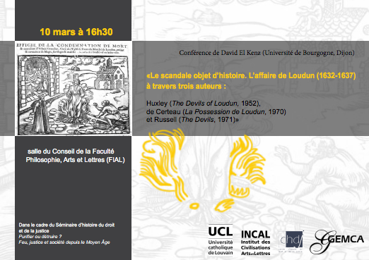 Dans le cadre du Séminaire d’histoire du droit et de la justice consacré au thème « Purifier ou détruire ? Feu, justice et société depuis le Moyen Âge » (UCL), David El Kenz (maître de conférences à l’Université de Bourgogne, Dijon) présentera une conférence intitulée Le scandale objet d’histoire. L’affaire de Loudun (1632-1637) à travers trois auteurs : Huxley (The Devils of Loudun, 1952), de Certeau (La Possession de Loudun, 1970) et Russell (The Devils, 1971), le lundi 10 mars 2014 à 16h30 en la salle du Conseil de la Faculté de Philosophie, Arts et Lettres (FIAL).