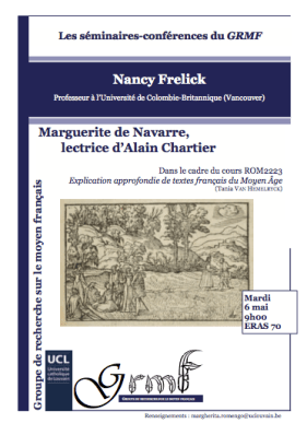 Le Groupe de recherche sur le moyen français (GRMF – UCL) a le plaisir de vous inviter à la conférence duProfesseur Nancy Frelick (University of British Columbia, Canada) le mardi 6 mai 2014 à 9h00, dans le cadre du cours de Tania Van Hemelryck, LROM 2223 Explication approfondie de textes français du Moyen Âge. Spécialiste de littérature française de la Renaissance, Nancy Frelick nous parlera de ses recherches sur Marguerite de Navarre et l’une de ses sources majeures, Alain Chartier.