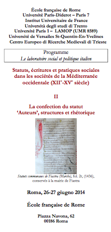 Ce second colloque, toujours centré sur l’Italie communale et l’espace du Midi français, voudrait porter une réflexion sur la manière dont un statut est construit en s’intéressant aux « auteurs » de la norme, à la rhétorique et à l’écriture utilisées lors de sa confection et à sa structure.