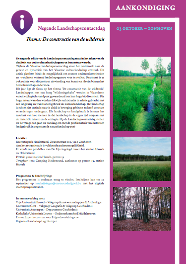 Dit jaar ligt de focus op het thema ‘De constructie van de wildernis’: Landschappen met een hoog “wildernisgehalte” worden in Vlaanderen vanuit ecologisch standpunt gewaardeerd om hun hoge biodiversiteit. Die hoge natuurwaarden worden dikwijls rechtstreeks in relatie gebracht met een langdurig en traditioneel gebruik als cultuurlandschap. Het landschap is echter niet statisch maar is altijd in beweging gebleven en heeft constant veranderingen ondergaan. Elk landschap en landgebruik is immers het resultaat van hoe mensen in dat landschap in de eigen tijd omgaan met de materiële ruimte en de ecologie. Op de Landschapscontactdag stellen we de vraag: hoe gaan we vandaag om met de problematiek van historisch landgebruik in zogenaamde natuurlandschappen?