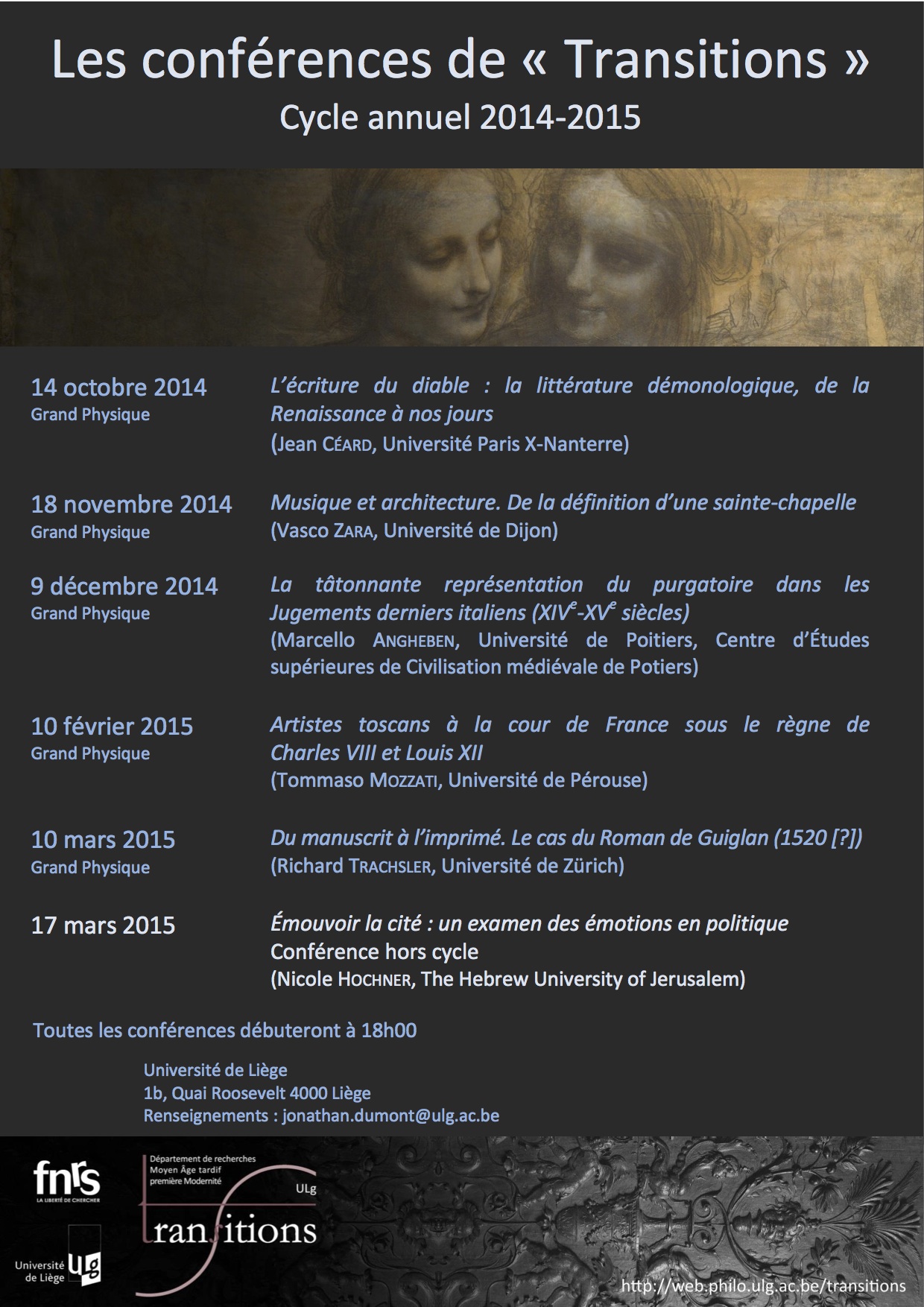 Programme du cycle de conférences 2014-2015 du Département de recherches « Transitions. Département de recherches sur le Moyen Âge tardif et la première Modernité » (Université de Liège) :