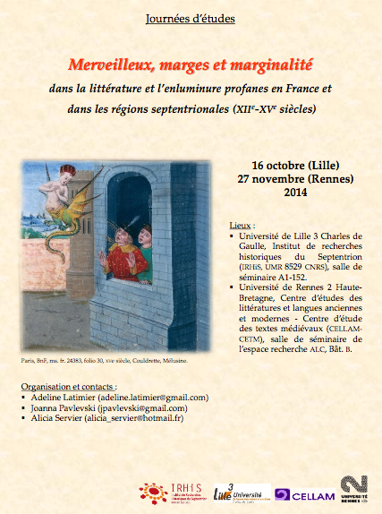 La représentation du merveilleux est peu étudiée car les travaux portant sur ce sujet émanent principalement de chercheurs en littérature. Pourtant, celui-ci étant par essence indicible et fondamentalement lié à la vue, une approche iconographique s’avère nécessaire : dans quelle mesure et par quels moyens figuratifs et conceptuels le merveilleux est-il représentable ? L’objectif des journées est, d’une part, d’étudier la figuration des lieux, des personnages et des objets merveilleux dans les miniatures et initiales enluminées, et la façon dont leur caractère marginal est signifié dans l’image. D’autre part, nous nous intéresserons au développement de thèmes et motifs merveilleux dans les marges des manuscrits profanes, les recherches s’étant concentrées jusqu’à présent sur les manuscrits sacrés. Il semble également important d’étudier conjointement les évolutions de la représentation du merveilleux dans la littérature et dans l’iconographie ainsi que l’influence de l’histoire des mentalités sur le travail des enlumineurs et les auteurs. Ces journées d’études entrent dans une démarche interdisciplinaire, réunissant autour d’un axe de recherche commun littéraires, historiens et historiens de l’art.