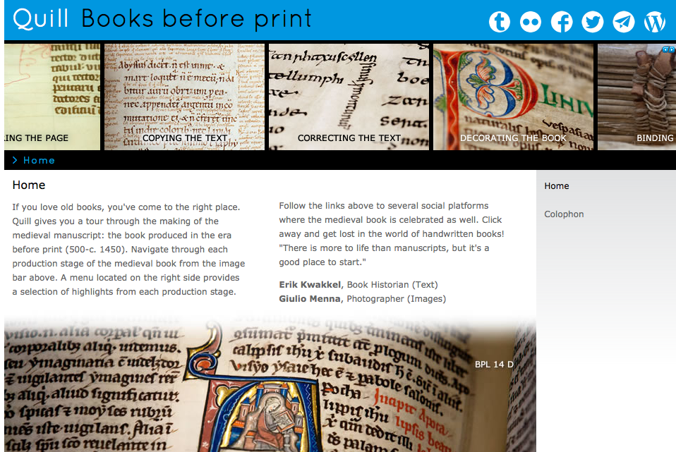 If you love old books, you’ve come to the right place. Quill gives you a tour through the making of the medieval manuscript: the book produced in the era before print (500-c. 1450). Navigate through each production stage of the medieval book from the image bar above. A menu located on the right side provides a selection of highlights from each production stage.
