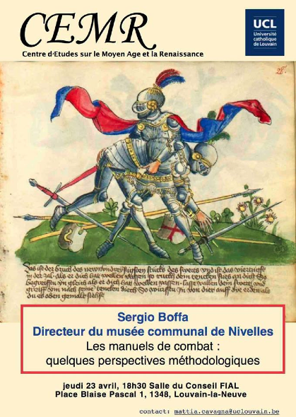 Le jeudi 23 avril, à 18h30, Sergio Boffa (Directeur du Musée communal de Nivelles) donnera une conférence intitulée Les manuels de combat : quelques perspectives méthodologiques à l’Université catholique de Louvain dans le cadre du cycle de conférences organisé par le Centre d’Études sur le Moyen Âge et la Renaissance.