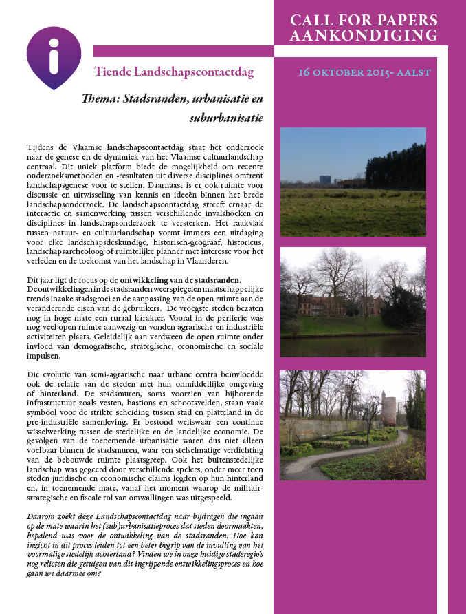 Daarom zoekt deze Landschapscontactdag naar bijdragen die ingaan op de mate waarin het (sub)urbanisatieproces dat steden doormaakten, bepalend was voor de ontwikkeling van de stadsranden. Hoe kan inzicht in dit proces leiden tot een beter begrip van de invulling van het voormalige stedelijk achterland? Vinden we in onze huidige stadsregio’s nog relicten die getuigen van dit ingrijpende ontwikkelingsproces en hoe gaan we daarmee om?