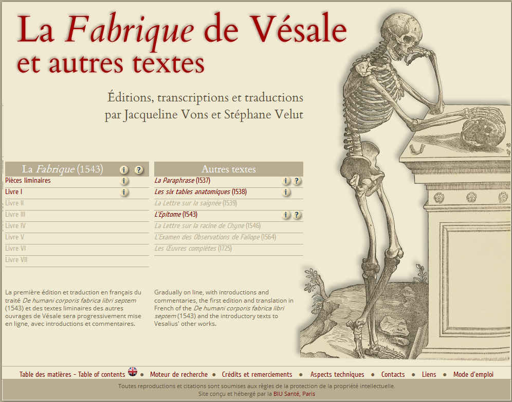 Jacqueline Vons et Stéphane Velut sont à l’initiative de la mise en ligne progressive de la première édition et de la traduction en français du traité De humani corporis fabrica libri septem (1543) et des textes liminaires des autres ouvrages de Vésale avec des introductions et des commentaires.