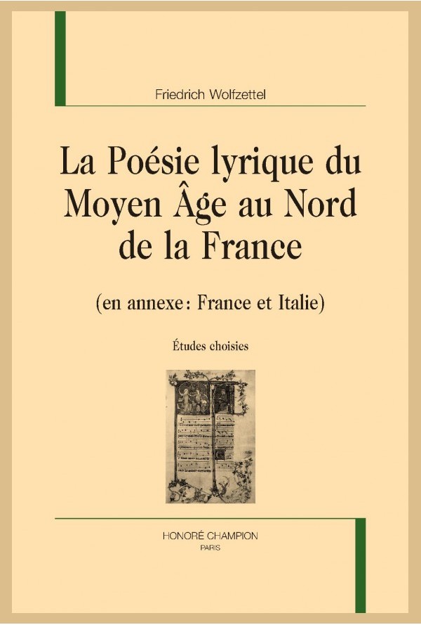 Friedrich Wolfzettel, La poésie lyrique du Moyen Âge au Nord de la France, Paris, Honoré Champion, 2015 (Nouvelle Bibliothèque du Moyen Âge, 113). 368 p., 15,5 x 23,5 cm. ISBN : 9782745328403. Prix : 70 euros.