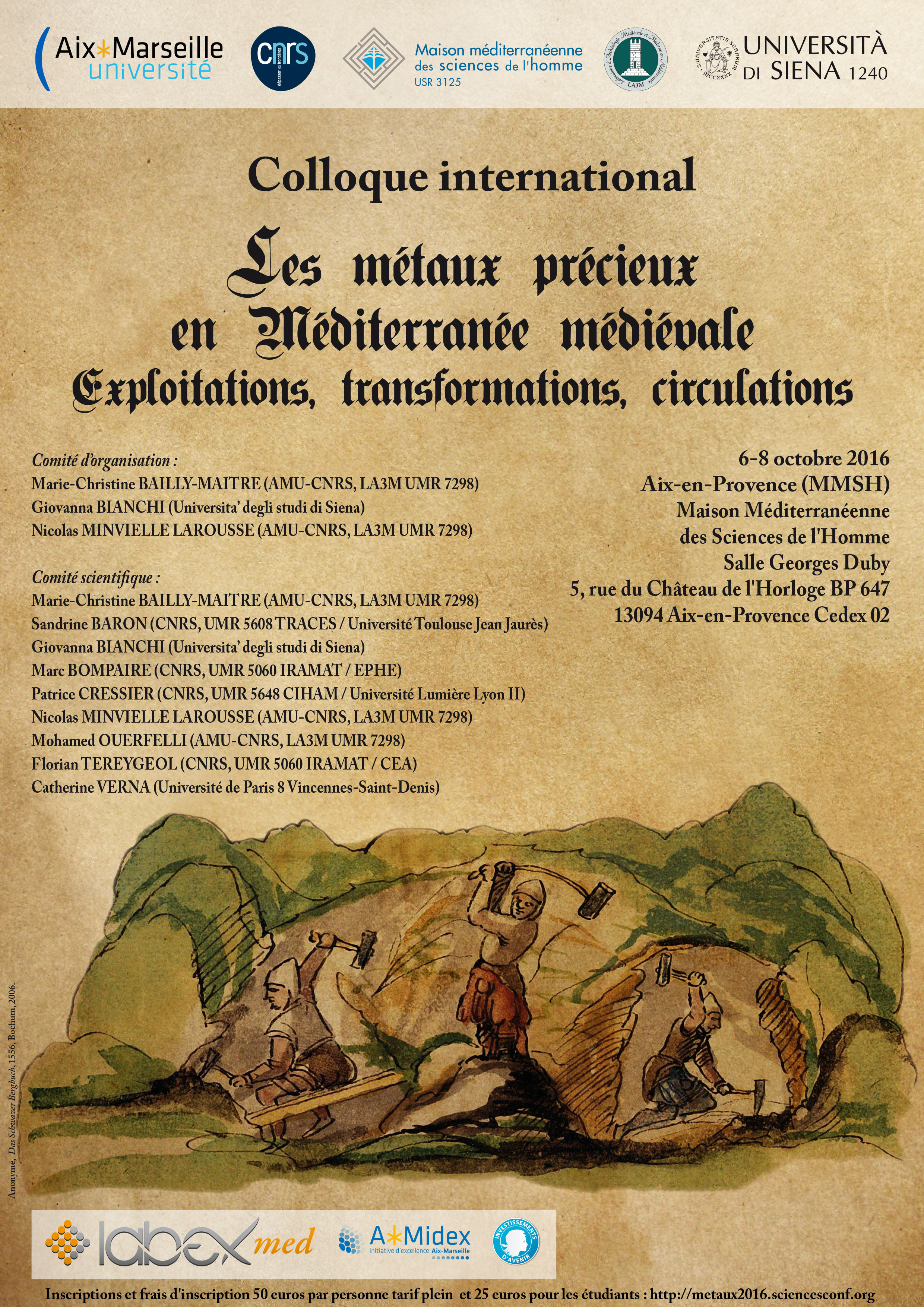 Le traçage des métaux de la production à l’utilisation est difficile à envisager pour les périodes anciennes. Lacune des sources, complexité des marchés, diffusion sur de grandes distances ; nombreux sont les écueils qui entravent la restitution d’un circuit économique. Elle est pourtant indispensable si l’on veut lier pleinement les espaces productifs aux économies et aux sociétés. Quels sont les caractères et l’évolution du marché des métaux précieux dans le bassin méditerranéen ? Y a-t-il un échange entre l’argent occidental et l’or oriental comme le laissent entendre certaines études ou doit-on revoir ce schéma ? À partir de travaux récents, cette session abordera en premier lieu les principales sources et méthodes complémentaires utilisées pour répondre à cette problématique : dépouillements de textes de la pratique, diplomatiques ou réglementaires ; études typo-chronologiques des objets métalliques ; recours à l’archéométrie (analyses traces), par exemple. En second lieu, elle sera l’occasion de présenter les résultats de ces recherches, à des échelles variées.
