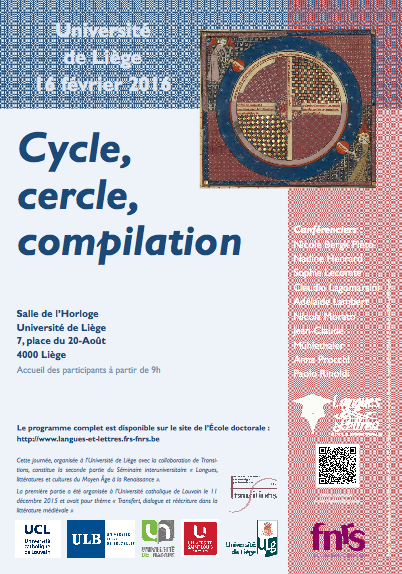 Cette journée, organisée à l’Université de Liège avec le soutien de Transitions, constitue la seconde partie du Séminaire interuniversitaire « Langues, littératures et cultures du Moyen Âge à la Renaissance ». La première partie a été organisée à l’Université catholique de Louvain le 11 décembre 2015 et avait pour thème « Transfert, dialogue et réécriture dans la littérature médiévale »