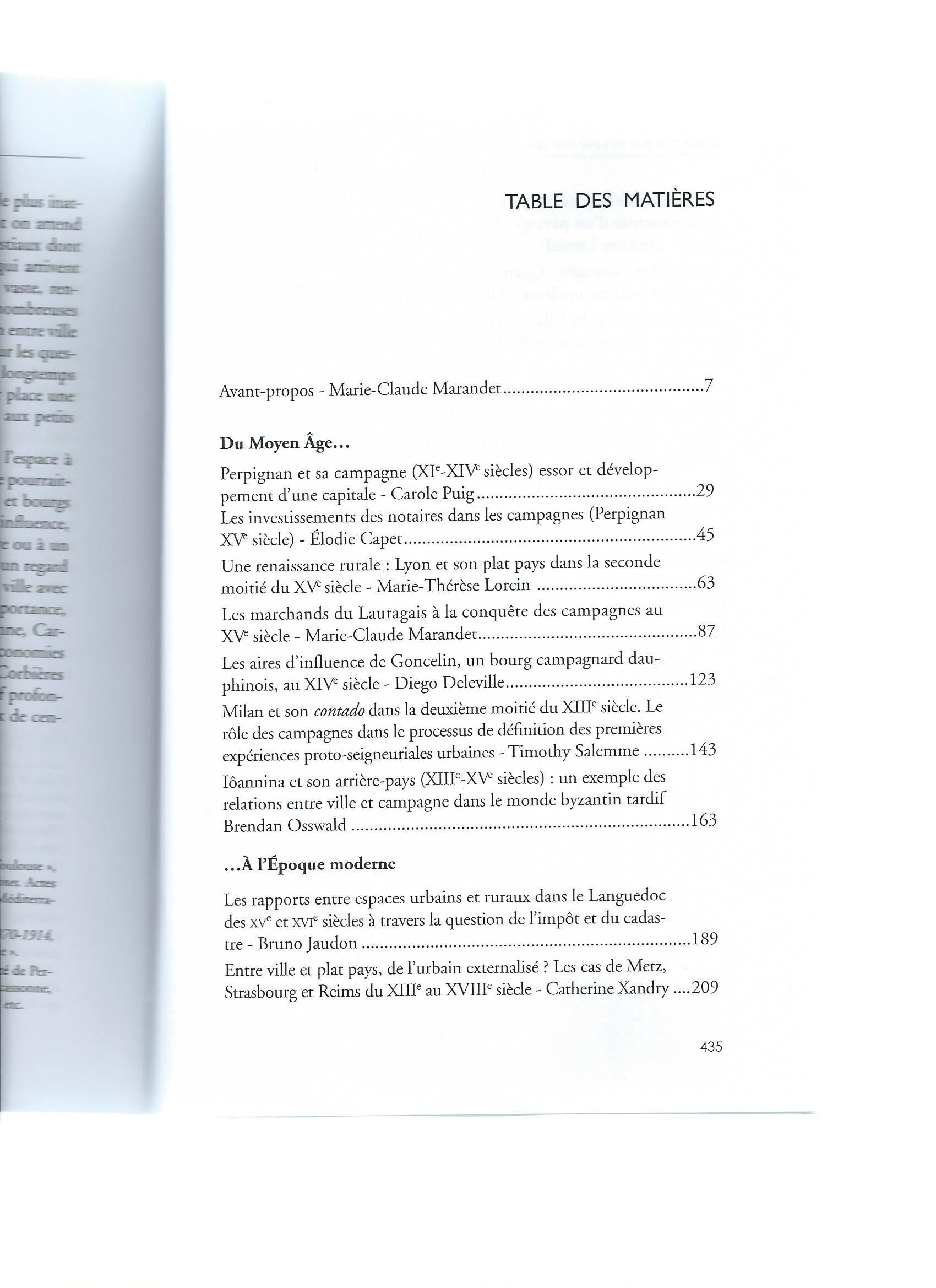 Cet ouvrage constitue la publication d’un colloque tenu en 2013 à l’université de Perpignan Via Domitia. Les diverses communications, émanant pour l’essentiel d’historiens, traitent des rapports entre villes et campagnes sur la longue durée (du Moyen Âge à la fin des Temps modernes). De nombreux thèmes sont abordés, en particulier les relations économiques (approvisionnement des villes, stimulation et orientation par celles-ci de la production), la création d’un nouveau paysage rural et péri-urbain, le développement des voies de communication, des marchés. Les investissements fonciers des citadins, les prêts qu’ils consentent aux paysans sont aussi évoqués. Une part est faite aux migrations de population en direction des villes. L’espace méditerranéen est privilégié (Midi de la France, principautés italiennes, Empire byzantin).