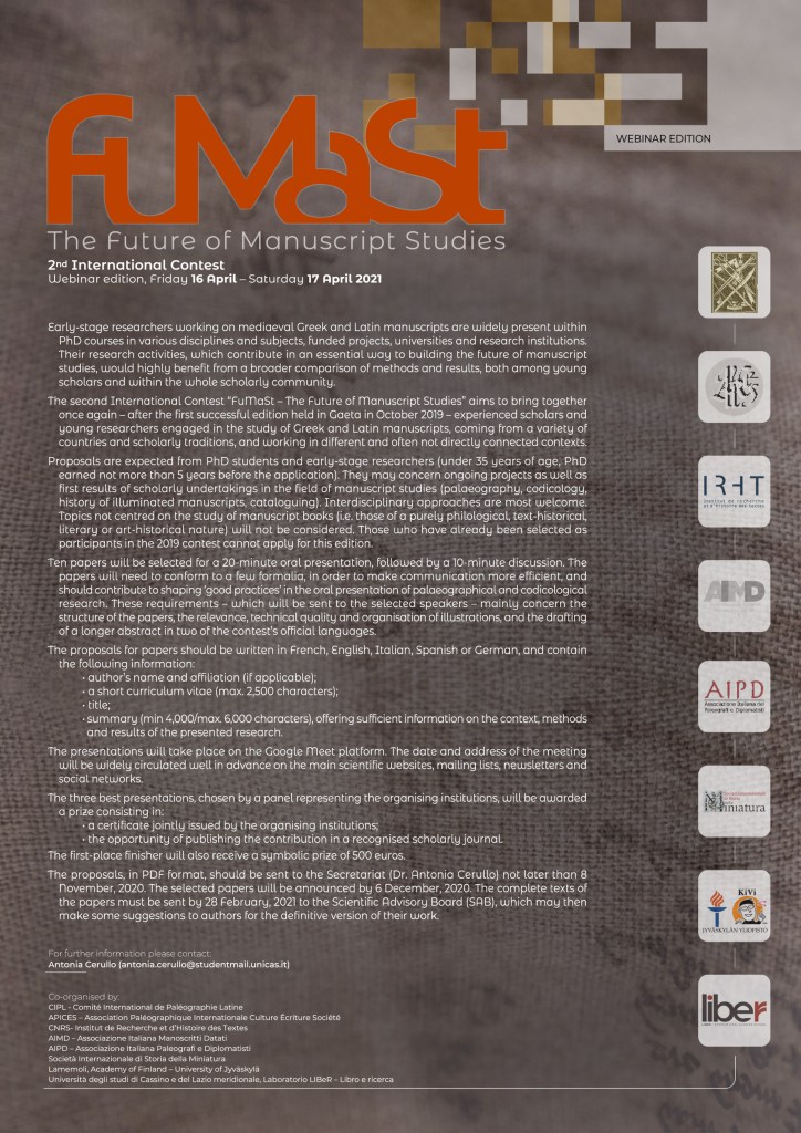 The second International Contest “FuMaSt – The Future of Manuscript Studies” aims to bring together once again – after the first successful edition held in Gaeta in October 2019 – experienced scholars and young researchers engaged in the study of Greek and Latin manuscripts, coming from a variety of countries and scholarly traditions, and working in different and often not directly connected contexts.