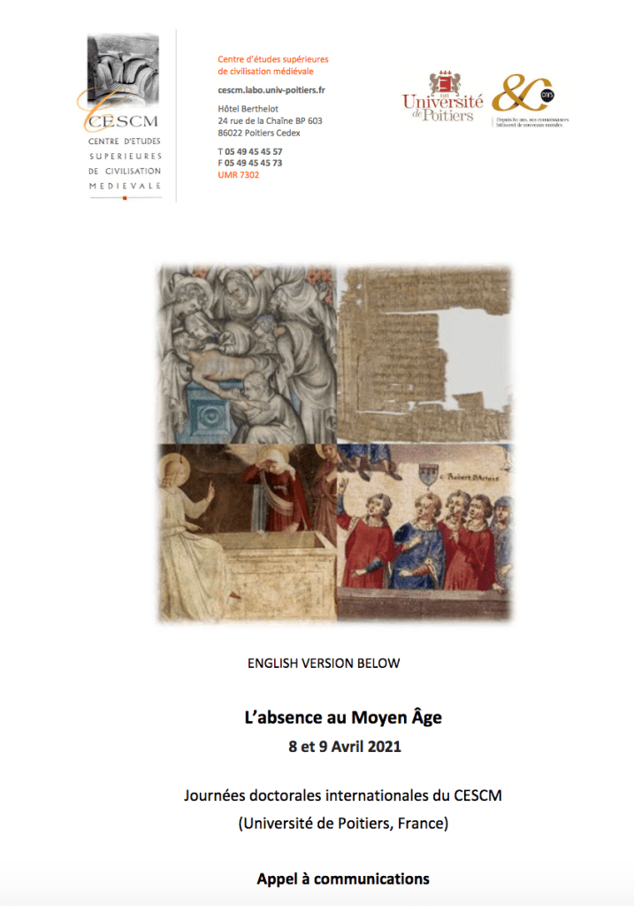 Un appel à communications est lancé pour un colloque sur le thème de l’absence au Moyen Âge. Organisé par les doctorantes et les doctorants du Centre d’études supérieures de civilisation médiévale, le colloque se tiendra à Poitiers en avril 2021. La manifestation prolongera les rencontres doctorales mises sur pied à Liège, en février dernier, et en constitueront le deuxième volet. Le troisième volet aura lieu à York, au sein du Centrer for medieval literature.