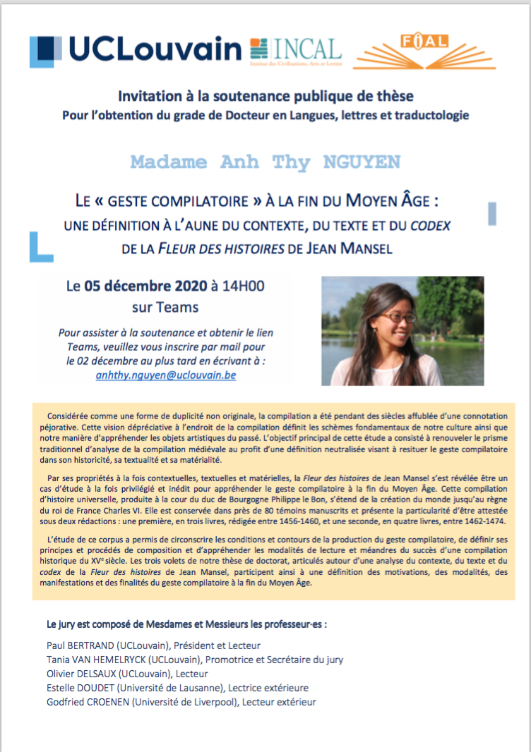 Invitation à la soutenance publique de thèse : Le « geste compilatoire » à la fin du Moyen Âge : une définition à l’aune du contexte, du texte et du codex de la Fleur des Histoires de Jean Mansel »